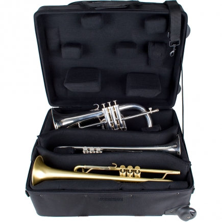 Protec IP301QWL, Trolli für 4 Trompeten, beliebig versetzbare Schaumstoffblöcke für den perfekten Sitz der Instrumente. Auch für 2 Trompeten-Flügelhorn geeignet.